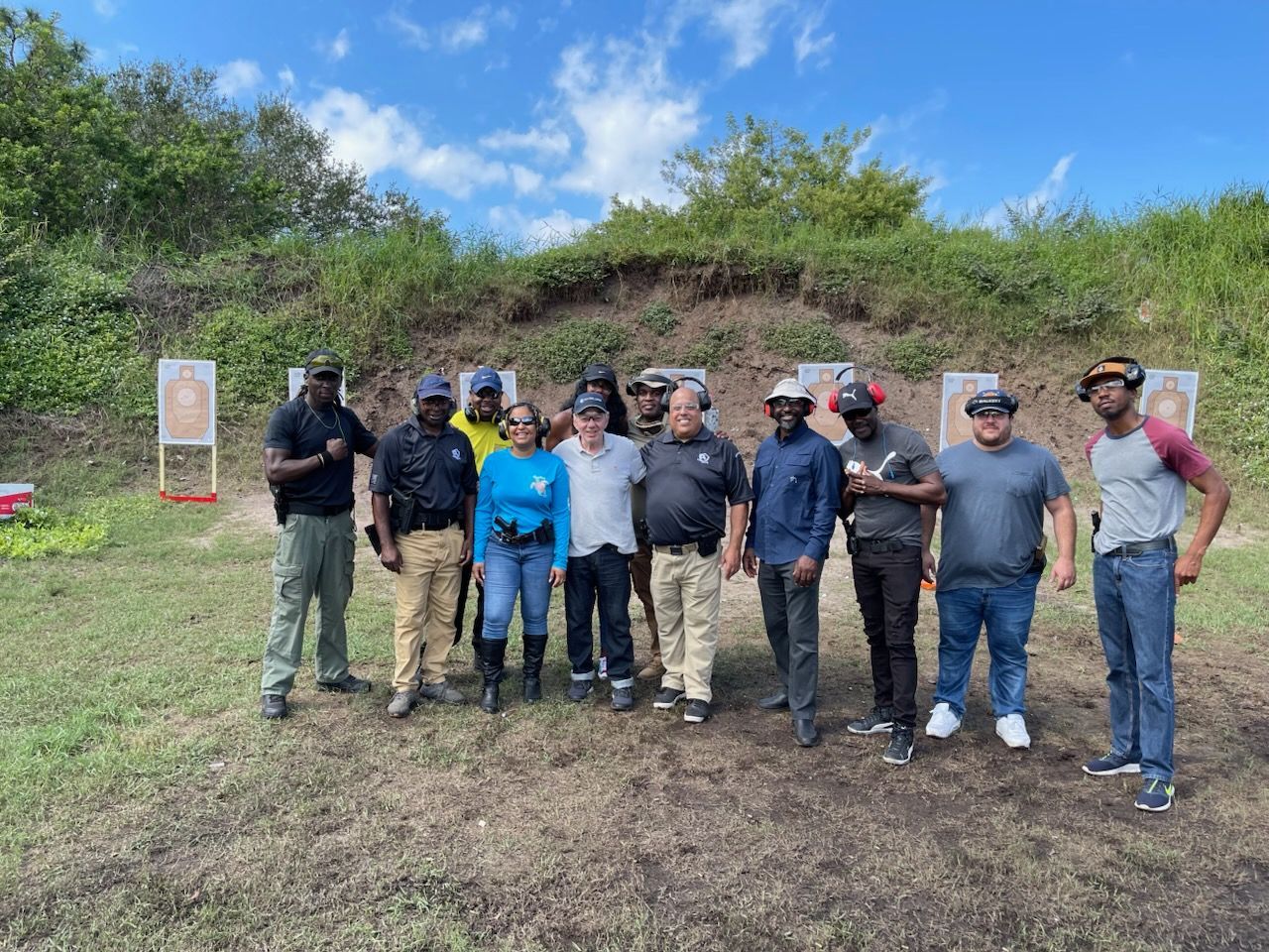 A Black man wearing a dark shirt and tan pants stands with an AR-15 rifle at a shooting range, a blue barrel behind him.